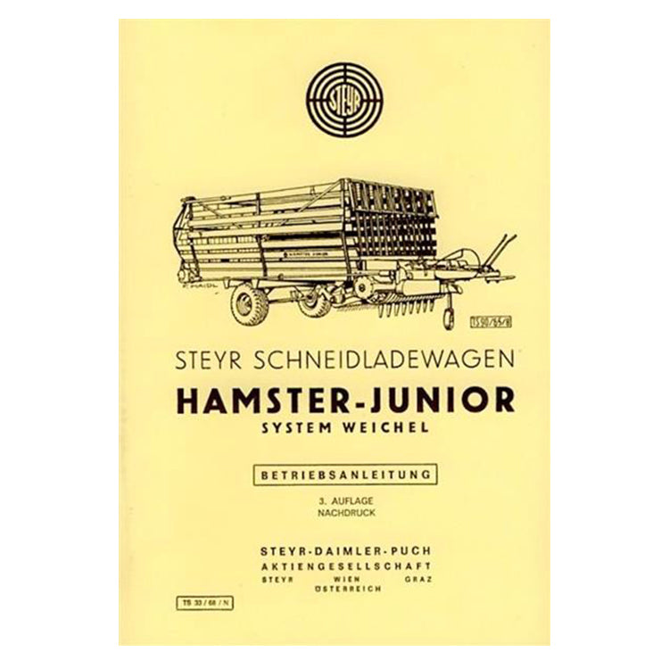Istruzioni per l'uso del carrello per tosare i criceti Steyr Hamster Junior System Weichel. Contenuto: Collegamento al veicolo trainante, funzionamento, carico, istruzioni di guida, scarico, manutenzione e cura, dati tecnici. Numero 4/1968, 36 pagine, DIN A5