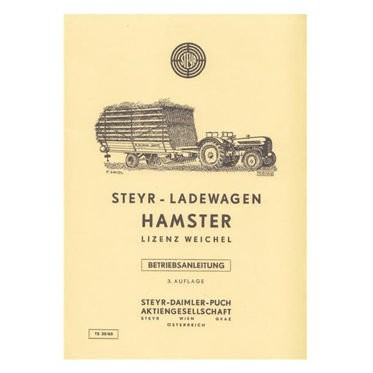 Istruzioni per l'uso del caricatore per criceti Steyr Hamster con licenza Weichel. Contenuto: Collegamento al veicolo trainante, funzionamento, carico, istruzioni di guida, scarico, manutenzione e cura, dati tecnici. Numero 4/1965, 44 pagine, DIN A5
