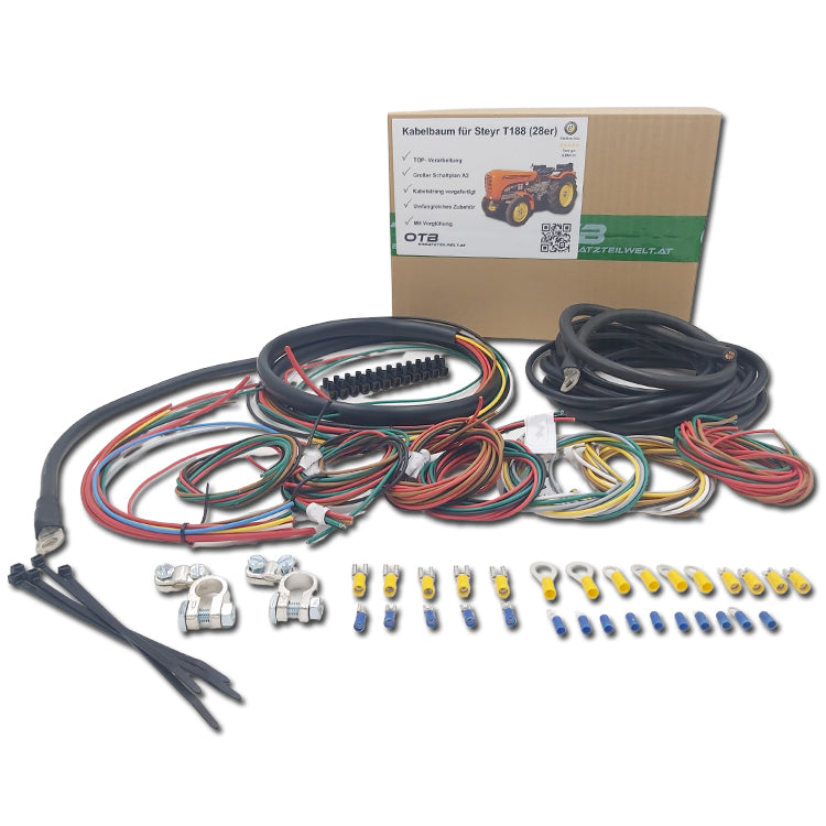Ob Frontscheinwerfer, Rückleuchten oder Hupe- viele Bauteile des Traktors werden elektrisch betrieben. Den Strom produziert die Lichtmaschine, Kabel leiten ihn an das jeweilige Bauteil weiter. Um diese Kabel übersichtlich montieren zu können, werden sie zu Kabelsträngen, den Kabelbäumen, zusammengefasst. Sie werden durch Schläuche, Kabelbinder oder Schellen aneinander fixiert. Ein Kabelbaum ist zwar weniger flexibel als die einzelnen Kabel, doch er kann einfacher an der Karosserie eingesetzt werden. So ist er vor äußeren Einwirkungen geschützt und verhindert einen platzraubenden Kabelsalat.