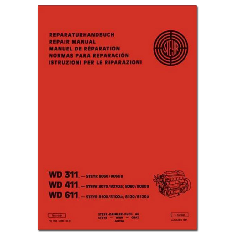 Werkstatthandbuch und Reparaturhandbuch für Steyr WD 311 - 8060, 8060a, WD 411 - 8070, 8070a, 8080, 8080a und WD 611 - 8100, 8100a, 8120, 8120a. Inhalt: technische Daten, Füllmengen, Zerlegen, Zusammenbau des gesamten Motors wird anhand von vielen Abbildungen genau beschrieben, Verschleißmaße, Einbauspiele und Anzugsmomente. Ausgabe 1981, 210 Seiten, DIN A4